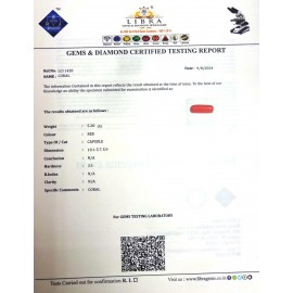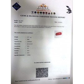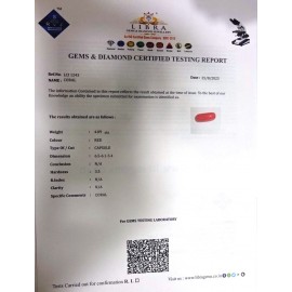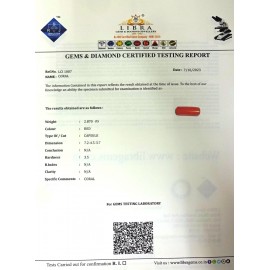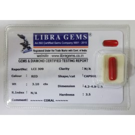 REPORT NO . LCI 309CLARITY . N/ACOLOUR . REDSHAPE / CUT . CAPSULEWT . 3.10 CTSDIMENSION . 4-2.4-8.5-5.R . INDEX . N/AHARDNESS . 3.5COMMENT . CORAL..