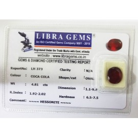REPORT.NO.-LH 373CLARITY.-N/ACOLOUR.-COCA COLASHAPE/CUT.-OVALWT.-4.81 CTSDIMENSION.-1-1.9-4.5-5.R.INDEX.-1.92-2.02HARDNESS.-6.5-7.5COMMENT.-HESSONITE..