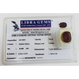 REPORT.NO.-LH 407CLARITY.-N/ACOLOUR.-COCA COLASHAPE/CUT.-OVALWT.-8.68 CTSDIMENSION.-3-9.10-8.6-1.R.INDEX.-1.92-2.02HARDNESS.-6.5-7.5COMMENT.-HESSONITE..