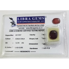 REPORT.NO.LH 729CLARITY.N/ACOLOUR.COCA COLASHAPE/CUT.OVALWT.9.00 CTSDIMENSION.3.6-2.2-6.1R.INDEX.1.92-2.02HARDNESS.6.5-7.5COMMENT.HESSONITE..