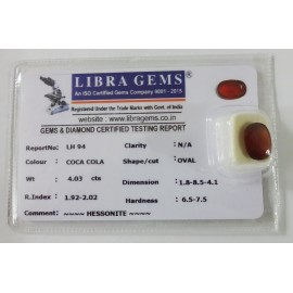 REPORT NO . LH 94CLARITY . N/ACOLOUR . COCA COLASHAPE / CUT . OVALWT . 4.03 CTSDIMENSION . 1-8.8-5.4-1.R . INDEX . 1.92-2.02HARDNESS . 6.5-7.5COMMENT . HESSONITE..