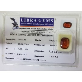 REPORT.NO.-LHS 125CLARITY.-N/ACOLOUR.-COCA COLASHAPE/CUT.-OVALWT.-4.00 CTSDIMENSION.-2.1-8.8-3.6R.INDEX.-1.92-2.02HARDNESS.-6.5-7.5COMMENT.-HESSONITE{S}..