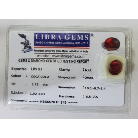 REPORT NO . LHS 93CLARITY . N/ACOLOUR . COCA COLASHAPE / CUT . OVALWT . 3.75 CTSDIMENSION . 10-1.8-7.5-4.R . INDEX . 1.92-2.02HARDNESS . 6.5-7.5COMMENT . HESSONITE { S }..