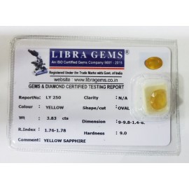 REPORT NO . LY 250CLARITY . N/ACOLOUR . YELLOWSHAPE / CUT . OVALWT . 3.83 CTSDIMENSION . 9-9.8-1.4-6.R . INDEX . 1.76-1.78HARDNESS . 9.0COMMENT . YELLOW SAPPHIRE..