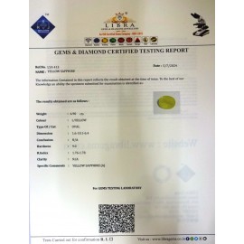 REPORT.NO.-LY 435CLARITY.-N/ACOLOUR.-YELLOWSHAPE/CUT.-OVALWT.-4.25 CTSDIMENSION.-10-9.8-4.4-6.R.INDEX.-1.76-1.78HARDNESS.-9.0COMMENT.-YELLOW SAPPHIRE..