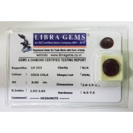 REPORT.NO.-LH 233CLARITY.-N/ACOLOUR.-COCA COLASHAPE/CUT.-OVALWT.-8.00 CTSDIMENSION.-2.6-1.9-6.1R.INDEX.-1.92-2.02HARDNESS.-6.5-7.5COMMENT.-HESSONITE..