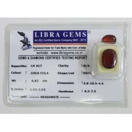 REPORT.NO.-LH 417CLARITY.-N/ACOLOUR.-COCA COLASHAPE/CUT.-OVALWT.-6.82 CTSDIMENSION.-3-8.10-5.4-9.R.INDEX.-1.92-2.02HARDNESS.-6.5-7.5COMMENT.-HESSONITE..