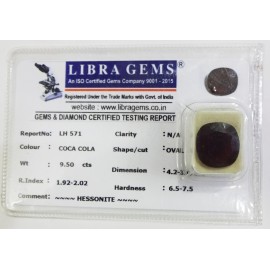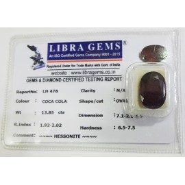 REPORT.NO.-LH 478CLARITY.-N/ACOLOUR.-COCA COLASHAPE/CUT.-OVALWT.-13.85 CTSDIMENSION.-7-1.2-1.6-9.R.INDEX.-1.92-2.02HARDNESS.-6.5-7.5COMMENT.-HESSONITE..
