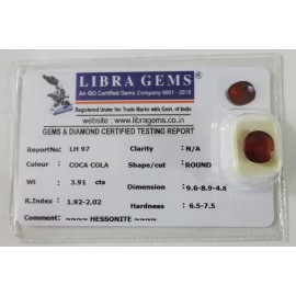 REPORT NO . LH 97CLARITY . N/ACOLOUR . COCA COLASHAPE / CUT . ROUNDWT . 3.91 CTSDIMENSION . 9-6.8-9.4-8.R . INDEX . 1.92-2.02HARDNESS . 6.5-7.5COMMENT . HESSONITE..