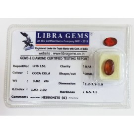 REPORT.NO.-LHS 151CLARITY.-N/ACOLOUR.-COCA COLASHAPE/CUT.-OVALWT.-3.82 CTSDIMENSION.-1-2.7-2.4-8.R.INDEX.-1.92-2.02HARDNESS.-6.5-7.5COMMENT.-HESSONITE { S }..