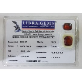 REPORT NO . LHS 87CLARITY . N/ACOLOUR . COCA COLASHAPE / CUT . OVALWT . 4.89 CTSDIMENSION . 1-1.9-5.5-3.R . INDEX . 1.92-2.02HARDNESS . 6.5-7.5COMMENT . HESSONITE { S }..