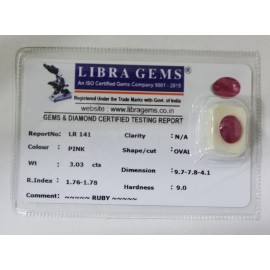 REPORT NO . LR 141CLARITY . N/ACOLOUR . PINKSHAPE / CUT . OVALWT . 3.03 CTSDIMENSION . 9-7.7-8.4-1.R . INDEX . 1.76-1.78HARDNESS . 9.0COMMENT . RUBY..