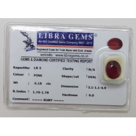 REPORT.NO.-LR 407CLARITY.-N/ACOLOUR.-PINKSHAPE/CUT.-OVALWT.-5.90 CTSDIMENSION.-2-2.10-4.4-6.R.INDEX.-1.76-1.78HARDNESS.-9.0COMMENT.-RUBY..