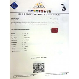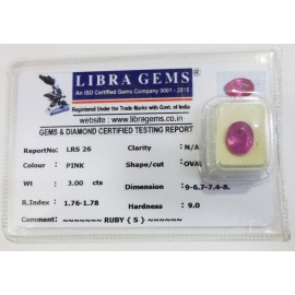 REPORT.NO.-LRS 26CLARITY.-N/ACOLOUR.-PINKSHAPE/CUT.-OVALWT.-3.00 CTSDIMENSION.-9-6.7-7.4-8.R.INDEX.-1.76-1.78HARDNESS.-9.0COMMENT.-RUBY { S }..