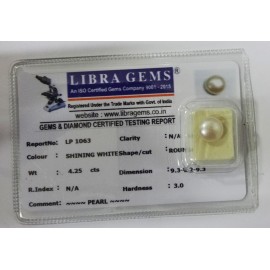 REPORT NO . LP 1063CLARITY . N/ACOLOUR . SHINING WHITESHAPE / CUT . ROUNDWT . 4.25 CTSDIMENSION . 9-3.6-2.9-3.R . INDEX . N/AHARDNESS . 3.0COMMENT . PEARL..