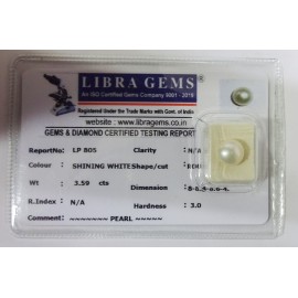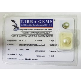 REPORT NO . LP 805CLARITY . N/ACOLOUR . SHINING WHITESHAPE / CUT . ROUNDWT . 3.59 CTSDIMENSION . 8-8.8-8.6-4.R . INDEX . N/AHARDNESS . 3.0COMMENT . PEARL..