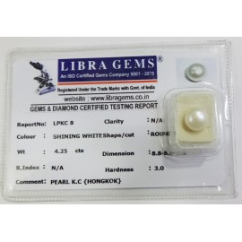 REPORT.NO.-LPKC 8CLARITY.-N/ACOLOUR.-SHINING WHITESHAPE/CUT.-ROUNDWT.-4.25 CTSDIMENSION.-8-8.8-6.7-6.R.INDEX.-N/AHARDNESS.-3.0COMMENT.-PEARL K.C { HONGKOK }..