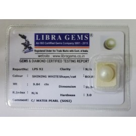 REPORT NO . LPS 92CLARITY . N/ACOLOUR . SHINING WHITESHAPE / CUT . ROUNDWT . 9.84 CTSDIMENSION . 10-9.1-1.1-1.R . INDEX . N/AHARDNESS . 3.0COMMENT . C / WATER PEARL { SOSI }..