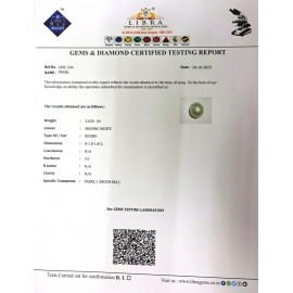 REPORT.NO.LPSC 107CLARITY.N/ACOLOUR.SHINING WHITESHAPE/CUT.ROUND WT.6.34 CTSDIMENSION.9.6-9.7-9.7R.INDEX.N/AHARDNESS.3.0COMMENT.PEARL {SOUTH SEA}..
