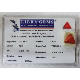 REPORT NO . LCI 142CLARITY . N/ACOLOUR . REDSHAPE / CUT . TRIANGLEWT . 5.58 CTSDIMENSION . 1-9.2-1.6-4.R . INDEX . N/AHARDNESS . 3.5COMMENT . CORAL..