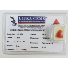 REPORT.NO.-LCI 806CLARITY.-N/ACOLOUR.-REDSHAPE/CUT.-TRIANGLEWT.-3.12 CTSDIMENSION.-10-9.9-5.5-8.R.INDEX.-N/AHARDNESS.35COMMENT.-CORAL..