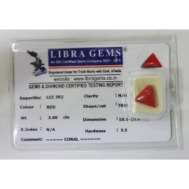 REPORT NO . LCI 392CLARITY . N/ACOLOUR . REDSHAPE / CUT . TRIANGLEWT . 3.69 CTSDIMENSION . 10-1.10-4.5-8.R . INDEX . N/AHARDNESS . 3.5COMMENT . CORAL..