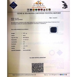 DATE:6-8-2024REF.NO:LN 1450NAME:BLUE SAPPHIREWEIGHT:11.08 CTSCOLOUR:BLUETYPE OF/CUT:RECTANGLEDIMENSION:10.2-9.7-8.1CONCLUSION:N/AHARDNESS:9.0R.INDEX:1.76-1.78CLARITY:N/ASPECIFIC COMMENTS:BLU..