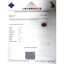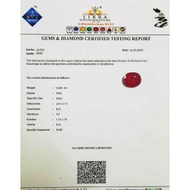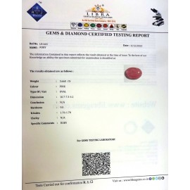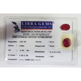 REPORT NO . LRA 58CLARITY . N/ACOLOUR . PINKSHAPE / CUT . OVALWT . 5.44 CTSDIMENSION . 1-1.9-1.5-8.R . INDEX . 1.76-1.78HARDNESS . 9.0COMMENT . RUBY { A }..