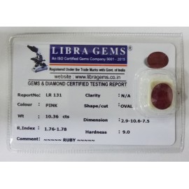 REPORT NO . LR 131CLARITY . N/ACOLOUR . PINKSHAPE / CUT . OVALWT . 10.36 CTSDIMENSION . 2-9.10-6.7-5.R . INDEX . 1.76-1.78HARDNESS . 9.0COMMENT . RUBY..