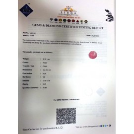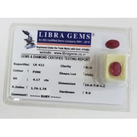 REPORT.NO.-LR 422CLARITY.-N/ACOLOUR.-PINKSHAPE/CUT.-OVALWT.-4.17 CTSDIMENSION.-10-4.7-4.4-8.R.INDEX.-1.76-1.78HARDNESS.-9.0COMMENT.-RUBY..