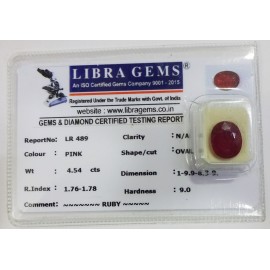 REPORT.NO.LR 489CLARITY.N/ACOLOUR.PINKSHAPE/CUT.OVALWT.4.54 CTSDIMENSION.1.9-9.8-3.9R.INDEX.1.76-1.78HARDNESS.9.0COMMENT.RUBY..