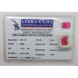 REPORT NO . LRA 16CLARITY . N/ACOLOUR . PINKSHAPE / CUT . RECTANGLEWT .3.72 CTSDIMENSION . 10-8.8-7.3-1.R . INDEX . 1.76-1.78HARDNESS . 9.0COMMENT . RUBY { A }..