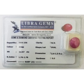 REPORT.NO.-LRA 156CLARITY.-N/ACOLOUR.-PINKSHAPE/CUT.-OVALWT.-12.67 CTSDIMENSION.-2-4.1-5.8-8.R.INDEX.-1.76-1.78HARDNESS.-9.0COMMENT.-RUBY { A }..