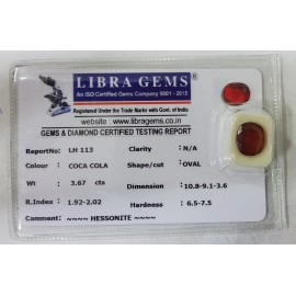 REPORT NO . LH 113CLARITY . N/ACOLOUR . COCA COLASHAPE / CUT . OVALWT . 3.67 CTSDIMENSION . 10-8.9-1.3-6.R . INDEX . 1.92-2.02HARDNESS . 6.5-7.5COMMENT . HESSONITE..
