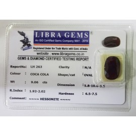 REPORT.NO.-LH 263CLARITY.-N/ACOLOUR.-COCA COLASHAPE/CUT.-OVALWT.-9.06 CTSDIMENSION.-5.8-10.6-6.5R.INDEX.-1.92-2.02HARDNESS.-6.5-7.5COMMENT.-HESSONITE..