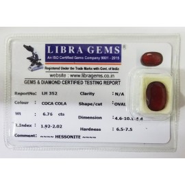 REPORT.NO.-LH 352CLARITY.-N/ACOLOUR.-COCA COLASHAPE/CUT.-OVALWT.-6.76 CTSDIMENSION.-4-6.10-1.4-4.R.INDEX.-1.92-2.02HARDNESS.-6.5-7.5COMMENT.-HESSONITE..