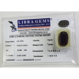 REPORT.NO.LH 534 CLARITY.N/ACOLOUR.COCA COLASHAPE/CUT.OVALWT.8.58 CTSDIMENSION. 5.4-9.6-5.8R.INDEX.1.92-2.02HARDNESS.6.5-7.5COMMENT.HESSONITE..
