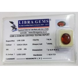 REPORT.NO.LHS 228CLARITY.N/ACOLOUR.COCA COLASHAPE/CUT.OVALWT.4.58 CTSDIMENSION.2.4-9.8-4.5R.INDEX.1.92-2.02HARDNESS.6.5-7.5COMMENT.HESSONITE {S}..