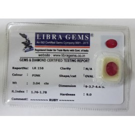 REPORT NO . LR 158CLARITY . N/ACOLOUR . PINKSHAPE / CUT . OVALWT . 3.04 CTSDIMENSION . 9-3.7-4.4-5.R . INDEX . 1.76-1.78HARDNESS . 9.0COMMENT . RUBY..