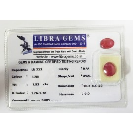 REPORT.NO.-LR 323CLARITY.-N/ACOLOUR.-PINKSHAPE/CUT.-OVALWT.-3.53 CTSDIMENSION.-10.3-8.5-3.9R.INDEX.-1.76-1.78HARDNESS.-9.0COMMENT.-RUBY..