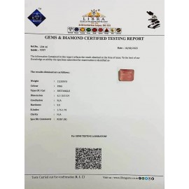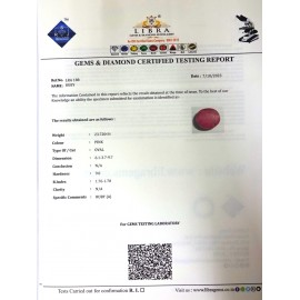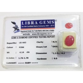 REPORT.NO.-LR 443CLARITY.-N/ACOLOUR.-PINKSHAPE/CUT.-OVALWT.-4.14 CTSDIMENSION.-1-1.9-1.4-3.R.INDEX.-1.76-1.78HARDNESS.-9.0COMMENT.-RUBY..