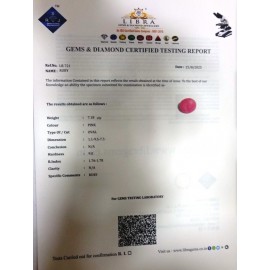 DATE: 11-4-2025REF.NO: LR  1077NAME: RUBYWEIGHT: 6.14 CTSCOLOUR: PINKTYPE OF/CUT: OVALDIMENSION: 2.1-9.5-5.1/CONCLUSION: N/AHARDNESS: 9.0R.INDEX: 1.76-1.78CLARITY: N/ASPECIFIC COMMENTS: RUBY..