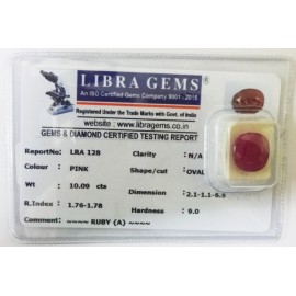 REPORT.NO.-LRA 128CLARITY.-N/ACOLOUR.-PINKSHAPE/CUT.-OVALWT.-10.09 CTSDIMENSION.-2-1.1-1.6-5.R.INDEX.-1.76-1.78HARDNESS.-9.0COMMENT.-RUBY { A }..