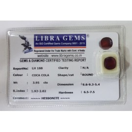 REPORT NO . LH 188CLARITY . N/ACOLOUR . COCA COLASHAPE / CUT . ROUNDWT . 3.95 CTSDIMENSION . 9-6.9-3.5-4.R . INDEX . 1.92-2.02HARDNESS . 6.5-7.5COMMENT . HESSONITE ..