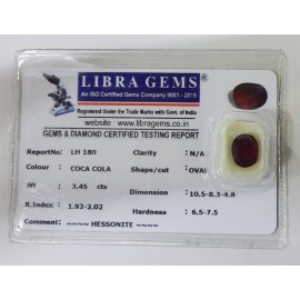 REPORT NO . LH 180CLARITY . N/ACOLOUR . COCA COLASHAPE / CUT . OVALWT . 3.45 CTSDIMENSION . 10-5.8-3.4-8.R . INDEX . 1.92-2.02HARDNESS . 6.5-7.5COMMENT . HESSONITE..