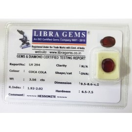 REPORT.NO.-LH 294CLARITY.-N/ACOLOUR.-COCA COLASHAPE/CUT.-OVALWT.-3.56 CTSDIMENSION.-9-5.8-6.4-8.R.INDEX.-1.92-2.02HARDNESS.-6.5-7.5COMMENT.-HESSONITE..