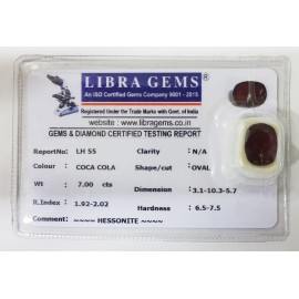 REPORT NO . LH 55CLARITY . N/ACOLOUR . COCA COLASHAPE / CUT . OVALWT . 7.00 CTSDIMENSION . 3-1.10-3.5-7.R . INDEX . 1.92-2.02HARDNESS . 6.5-7.5COMMENT . HESSONITE..