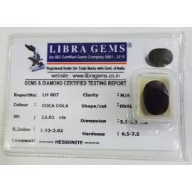 REPORT.NO.-LH 607CLARITY.-N/ACOLOUR.-COCA COLASHAPE/CUT.-OVALWT.-12.01 CTSDIMENSION.-5-1.1-1.7-8.R.INDEX.-1.92-2.02HARDNESS.-6.5-7.5COMMENT.-HESSONITE..
