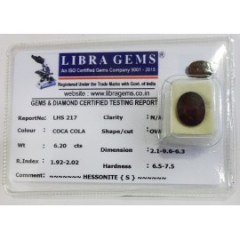REPORT.NO.LHS 217CLARITY.N/ACOLOUR.COCA COLASHAPE/CUT.OVALWT.6.20 CTSDIMENSION.2.1-9.6-6.3R.INDEX.1.92-2.02HARDNESS.6.5-7.5COMMENT.HESSONITE {S}..