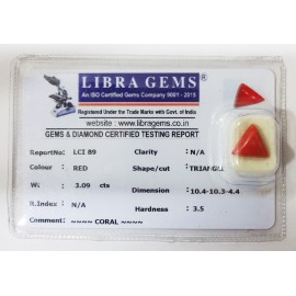 REPORT NO . LCI 89CLARITY . N/ACOLOUR . REDSHAPE / CUT . TRIANGLEWT . 3.09 CTSDIMENSION . 10-4.10-3.4-4.R . INDEX . N/AHARDNESS . 3.5COMMENT . CORAL..